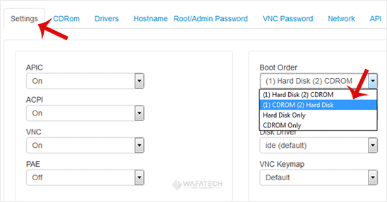 3. Scroll down. Under the settings tab, change the Boot Order to (1) CDROM (2) Hard Disk.
